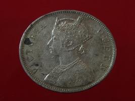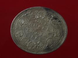| Description / विवरण | The obverse shows the crowned bust of Victoria facing left, with the divided legend on either side along the edge. Milled rim, with dotted circle. Obverse legend Victoria Queen. Reverse, in centre, surrounded by floral border One rupee India 1862. Double circle with dots along the edge. |