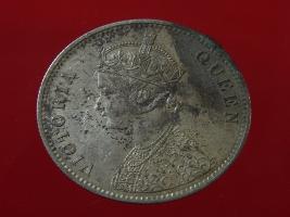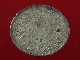 | Description / विवरण | The obverse shows the crowned bust of Victoria facing left, with the divided legend on either side along the edge. Milled rim, with dotted circle. Obverse legend Victoria Queen. Reverse, in centre, surrounded by floral border One rupee India 1862. Double circle with dots along the edge. |