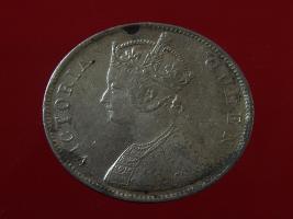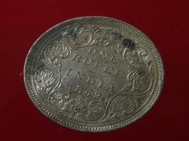 | Description / विवरण | The obverse shows the crowned bust of Victoria facing left, with the divided legend on either side along the edge. Milled rim, with dotted circle. Obverse legend Victoria Queen. Reverse, in centre, surrounded by floral border One rupee India 1862. Double circle with dots along the edge. |