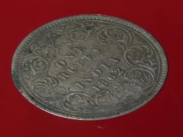 | Description / विवरण | The obverse shows the crowned bust of Victoria facing left, with the divided legend on either side along the edge. Milled rim, with dotted circle. Obverse legend Victoria Queen. Reverse, in centre, surrounded by floral border One rupee India 1862. Double circle with dots along the edge. |