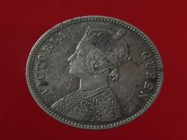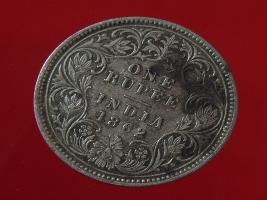 | Description / विवरण | The obverse shows the crowned bust of Victoria facing left, with the divided legend on either side along the edge. Milled rim, with dotted circle. Obverse legend Victoria Queen. Reverse, in centre, surrounded by floral border One rupee India 1862. Double circle with dots along the edge. |
