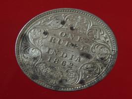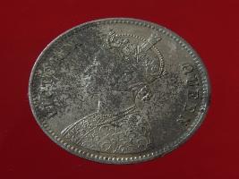 | Description / विवरण | The obverse shows the crowned bust of Victoria facing left, with the divided legend on either side along the edge. Milled rim, with dotted circle. Obverse legend Victoria Queen. Reverse, in centre, surrounded by floral border One rupee India 1862. Double circle with dots along the edge. |