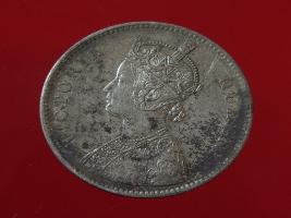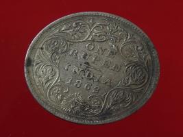 | Description / विवरण | The obverse shows the crowned bust of Victoria facing left, with the divided legend on either side along the edge. Milled rim, with dotted circle. Obverse legend Victoria Queen. Reverse, in centre, surrounded by floral border One rupee India 1862. Double circle with dots along the edge. |