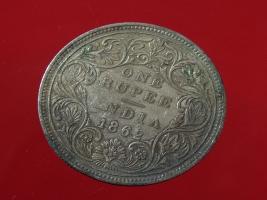 | Description / विवरण | The obverse shows the crowned bust of Victoria facing left, with the divided legend on either side along the edge. Milled rim, with dotted circle. Obverse legend Victoria Queen. Reverse, in centre, surrounded by floral border One rupee India 1862. Double circle with dots along the edge. |