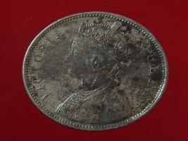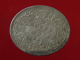 | Description / विवरण | The obverse shows the crowned bust of Victoria facing left, with the divided legend on either side along the edge. Milled rim, with dotted circle. Obverse legend Victoria Queen. Reverse, in centre, surrounded by floral border One rupee India 1862. Double circle with dots along the edge. |