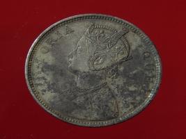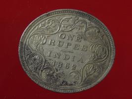 | Description / विवरण | The obverse shows the crowned bust of Victoria facing left, with the divided legend on either side along the edge. Milled rim, with dotted circle. Obverse legend Victoria Queen. Reverse, in centre, surrounded by floral border One rupee India 1862. Double circle with dots along the edge. |