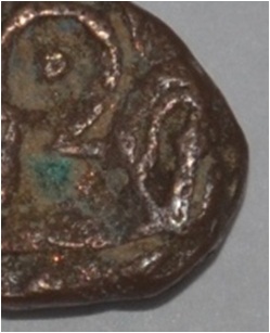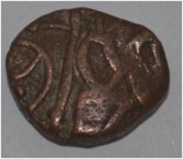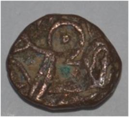 Coin in irregular shape. Obverse Horseman to the left. Man on the horseback and flagpole at the back of horse. Reverse Couchant bull facing right and traces of legend on the top.