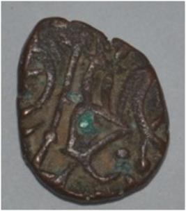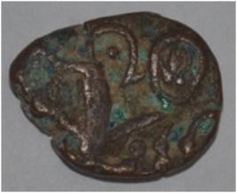 Coin in irregular shape. Obverse Horseman to the left. Man on the horseback and flagpole at the back of horse. Reverse Couchant bull facing right and hump on the top.