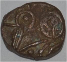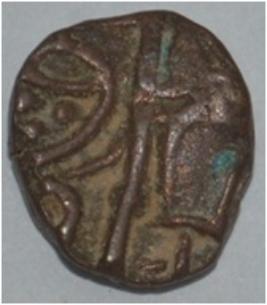 Coin in irregular shape. Obverse Horseman to the left. Man on the horseback and flagpole at the back of horse. Reverse Couchant bull facing right and hump on the top.