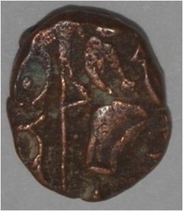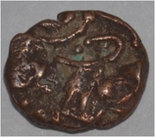 Coin in irregular shape. Obverse Horseman to the left. Man on the horseback and flagpole at the back of horse. Reverse Couchant bull facing right.