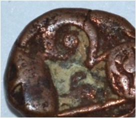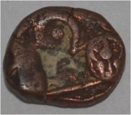 Coin in irregular shape. Obverse Horseman to the left. Man on the horseback and flagpole at the back. Reverse Couchant bull facing right and hump on the top.
