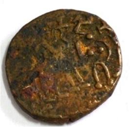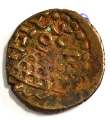 Obverse Deer on the left facing female figure with upraised right hand and left hand on hip. Traces of legend on the top. Reverse Triangle headed on the right and swastika above it, ten arched hill with umbrella at the centre and nandi pada on the top.