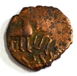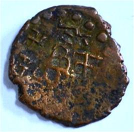 Coin in irregular shape. Obverse Deer on the right facing female figure. Traces of legend at the bottom. Reverse Triangle headed on the right and swastika above it, six arched hill with umbrella at the centre , tree in railing in left and nandi pada on the top.