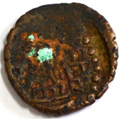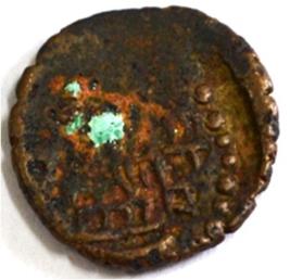 Coin in irregular shape. Obverse Deer on the left facing female figure. Traces of legend at the bottom. Reverse Four arched hill with umbrella on the left, tree in railing at the centre with horizontal branches and triangle headed on the left.