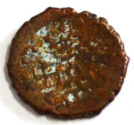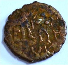 Coin in irregular shape. Obverse Deer at the top facing female figure with upraised right hand and left hand on hip. Traces of legend at the bottom. Reverse Triangle headed on the right and swastika above it, arched hill with umbrella at the centre, tree in railing in left and nandi pada on the top.