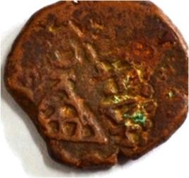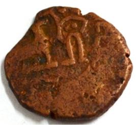 Coin in irregular shape. Obverse Deer on the top facing female figure with upraised right hand and left on hip. Traces of legend below. Reverse Six arched hill with umbrella on the right, triangle headed with a base on the left and swastika above.