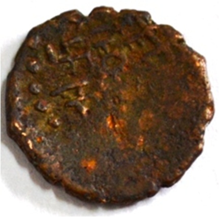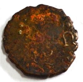 Coin in irregular shape. Obverse Female figure in left and traces of legend at the bottom. Reverse Triangle headed on the right and swastika above, arched hill with umbrella at the centre and tree in railing in left.