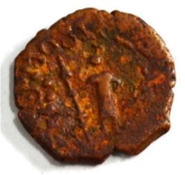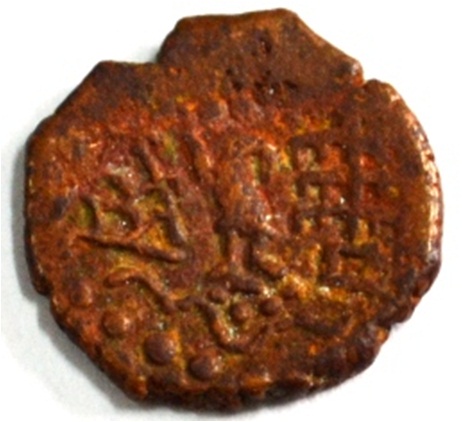 Coin in irregular shape. Obverse Kartikeya standing and facing. Sakti in right hand and left hand on hip. Traces of legend in right side. Reverse Arched hill on the right, female figure at the centre and tree in railing showing three horizontal branches in left.