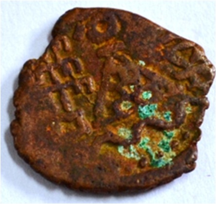Coin in irregular shape. Obverse Deer on the right facing female figure with upraised right hand and left hand on hip. Traces of legend around. Reverse Tree in railing on the right, arched hill with umbrella at the centre and triangle headed on the left.