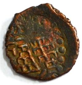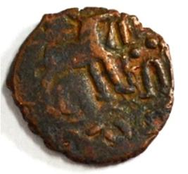 Coin in irregular shape. Obverse Deer on the top and facing female figure with upraised right hand. Traces of legend below. Reverse Swastika in right, six arched hill with umbrella at the centre, tree in railing with three horizontal branches in left and nandi pada above the arched hill.
