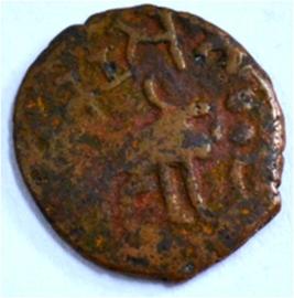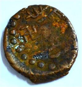 Coin in irregular shape. Obverse Deer at the centre and facing female figure with upraised right hand. Traces of legend on the top. Reverse Swastika in right, arched hill with umbrella at the centre, tree branches depict top left and nandi pada on the top.