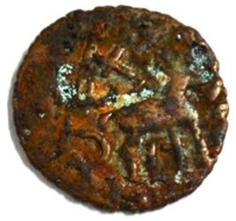 Coin in irregular shape. Obverse Deer at the centre and facing left.Traces of legend around. Reverse Triangle headed on the right and swastika above it, arched hill with umbrella at the centre, tree in railing in left and nandi pada on the top.
