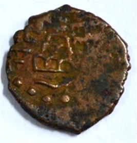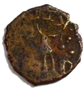 Coin in irregular shape. Obverse Deer at the centre and facing female figure with upraised right hand. Brahmi legend on the top. Reverse Triangle headed on the right, six arched hill with umbrella at the centre and tree branches in left.