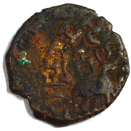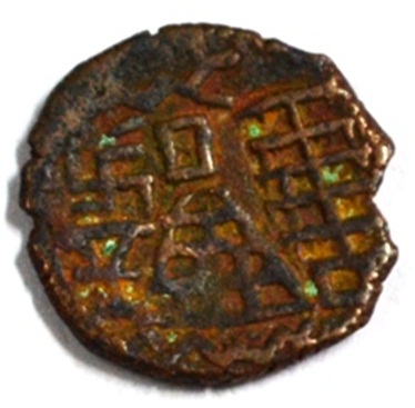 Coin in irregular shape. Obverse Deer at the bottom left side and traces of legend in semi-circle. Reverse Triangle headed on the right and swastika above it, ten arched hill with umbrella at the centre, tree in railing with five horizontal branches with short vertical leaves in left and nandi pada on the top.