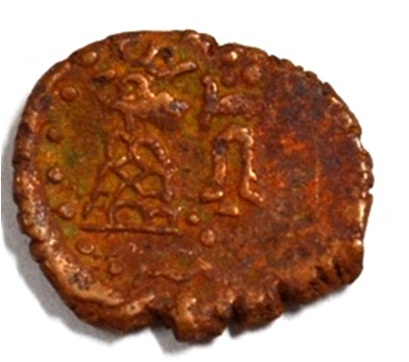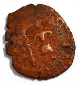 Coin in irregular shape. Obverse Male Kartikeya standing and facing. Sakti in right hand and left on hip. Traces of legend in semi-circle in left. Reverse Nine arched hill with umbrella on the right, female figure standing and facing, right hand upraised, and nandi pada on the top.