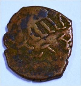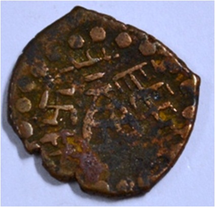 Coin in irregular shape. Obverse Deer on the top without head and brahmi legend below. Reverse Triangle headed on the right and swastika above it, arched hill with umbrella at the centre, tree in railing in left and nandi pada on the top.