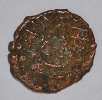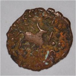 Coin in irregular shape. Obverse Deer on the left and facing female figure with upraised right hand. Brahmi legend in semi-circle. Reverse Triangle headed on the right and swastika above it, arched hill with umbrella at the centre and tree in railing in left.