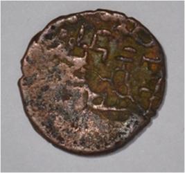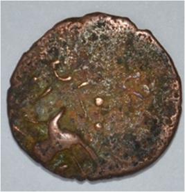 Coin in irregular shape. Obverse Deer at the bottom and facing female with upraised right hand. Brahmi legend above. Reverse Arched hill with umbrella at the centre, tree in railing in left, nandi pada and swastika on the top.