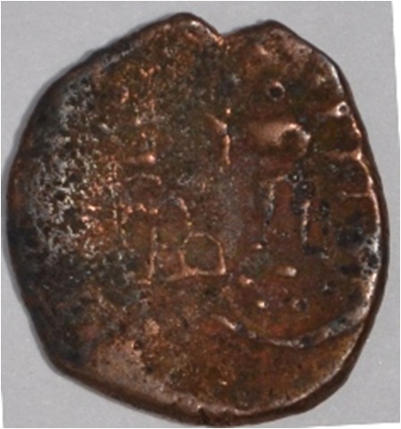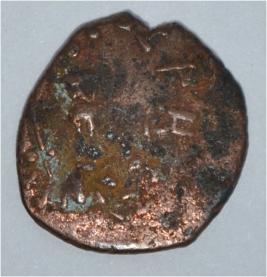 Coin in irregular shape. Obverse Male Kartikeya standing and facing. Sakti in right hand. Traces of legend in left side. Reverse Arched hill with umbrella on the right, female shashthi standing and facing, right hand upraised and left hand on hip.