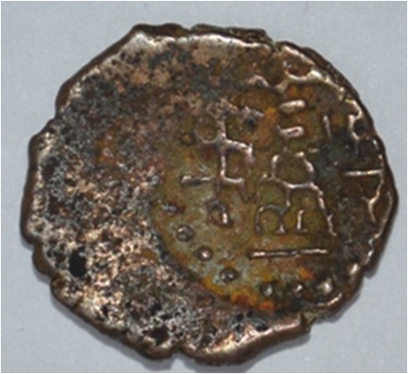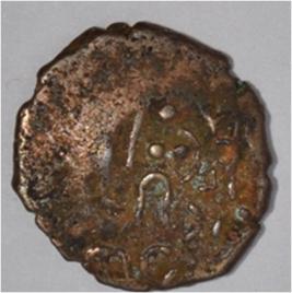 Coin in irregular shape. Obverse Female standing and facing with upraised right hand and left hand on hip. Brahmi legend below. Reverse Tree in railing, six arched hill with umbrella at the centre, triangle headed on the left and swastika above and nandi pada on the top.
