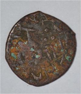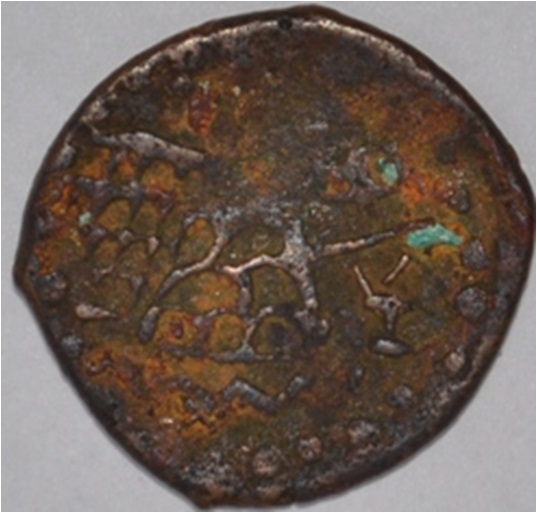 Coin in irregular shape. Obverse Deer facing female figutre and brahmi legend on the top and bottom. Reverse Tree in railing in right, six arched hill with umbrella at the centre, triangle headed on the left.