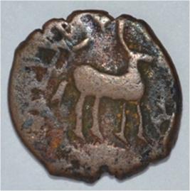 Coin in irregular shape. Obverse Deer at the centre and facing left. Brahmi legend in semi-circle. Reverse Tree in railing in right, six arched hill with umbrella at the centre, triangle headed on the right, swastika above it, and nandi pada on the top.
