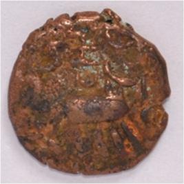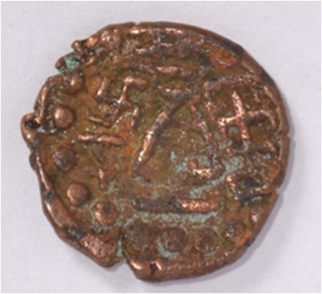 Coin in irregular shape. Obverse Deer at the bottom and brahmi legend above. Reverse Triangle headed on the right and swastika above it, arched hill with umbrella at the centre, tree in railing with three horizontal branches with short vertical leaves in left and nandi pada on the top.