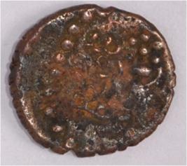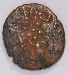 Coin in irregular shape. Obverse Seven headed male Kartikeya standing and facing. Sakti in right hand and left hand on hip. Traces of legend in top left. Reverse Arched hill with umbrella at the centre, six headed female standing and facing, right hand upraised, left hand on hip and nandi pada on the top.