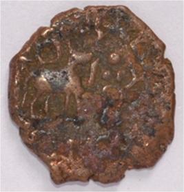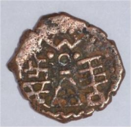 Coin in irregular shape. Obverse Deer on the top facing female with upraised right hand left hand on hip. Brahmi legend in semi-circle.. Reverse Triangle headed on the right and swastika above it, six arched hill with umbrella at the centre, tree in railing with four horizontal branches in left and nandi pada on the top.