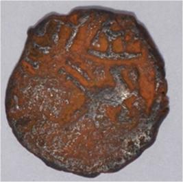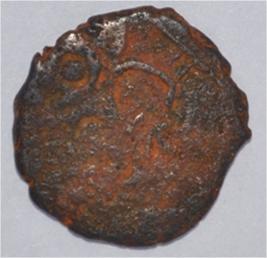 Coin in irregular shape. Obverse Traces of legend on the top and rest of the coin eroded. Reverse Brahmi legend and arched hill on the top and unidentified figure below.