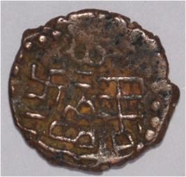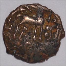 Coin in irregular shape. Obverse Deer on the top and facing female figure. Brahmi legend in semi-circle. Reverse Triangle headed on the right and swastika above , six arched hill with umbrella at the centre, tree in railing in left and nandi pada on the top.