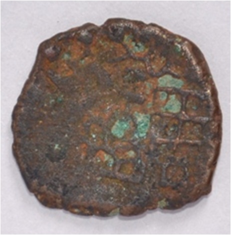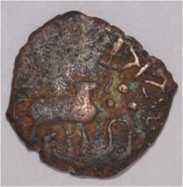 Coin in irregular shape. Obverse Deer facing female figure with upraised right hand. Brahmi legend on the top left. Reverse Swastika on the top right, six arched hill with umbrella at the centre, tree in railing in left and nandi pada on the top.