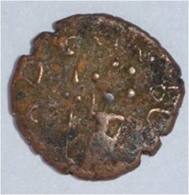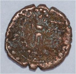 Coin in irregular shape. Obverse Five headed male Kartikeya standing and facing. Sakti in right hand and left hand on hip. Traces of legend in semi-circle. Reverse Six arched hill with umbrella on the right, nandi pada above, seven headed female shashthi standing and facing, right hand upraised and left hand on hip. Tree in railing with three horizontal branches with short vertical leaves in left.