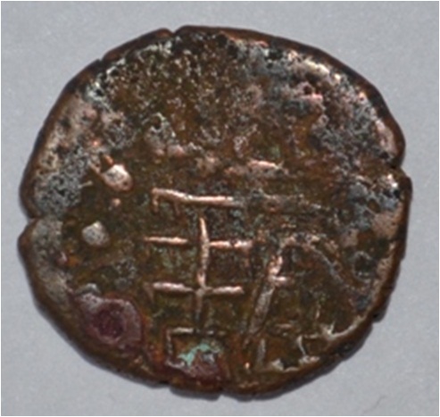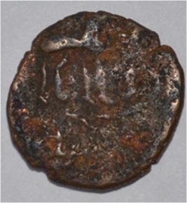 Coin in irregular shape. Obverse Deer on the top and facing female figure. Brahmi legend below. Reverse Tree in railing in left, arched hill at the centre and nandi pada on the top.