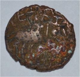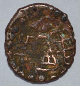 Coin in irregular shape. Obverse Deer at the centre and facing female figure with upraised right hand. Brahmi legend above. Reverse Triangle headed on the right and swastika above, arched hill with umbrella at the centre, tree in railing in left.