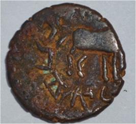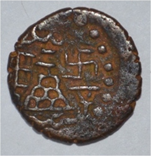 Coin in irregular shape. Obverse Deer on the left without head and brahmi legend in semi-circle. Reverse Tree branches in right, six arched hill with umbrella at the centre, triangle headed on the left and swastika above and nandi pada in top right.