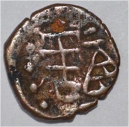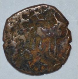 Coin in irregular shape. Obverse Deer on the left and brahmi legend in semi-circle. Reverse Tree in railing with three horizontal branches with short vertical leaves at the centre and five arched hill with umbrella on the left.