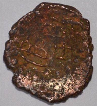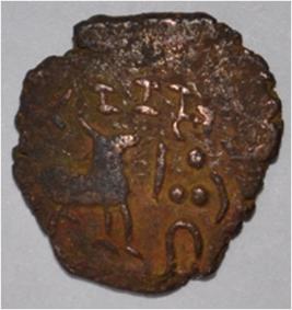 Coin in irregular shape. Obverse Deer facing female figure with upraised right hand and left hand on the hip. Brahmi legend on the top. Reverse Six arched hill with umbrella at the centre and tree in railing with horizontal branches in left.