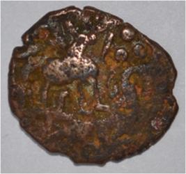 Coin in irregular shape. Obverse Deer on the top and facing female figure with upraised right hand and left on the hip. Brahmi legend in semi-circle. Reverse Swastika on the lower right, arched hill with umbrella at the centre, tree in railing in left and nandi pada on the top.