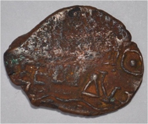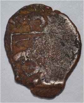 Coin in irregular shape. Obverse Standard at the left bottom and coin is not clear. Reverse Half portion of female figure on the top left, Traces of legend at the lower portion and wavy line below it.